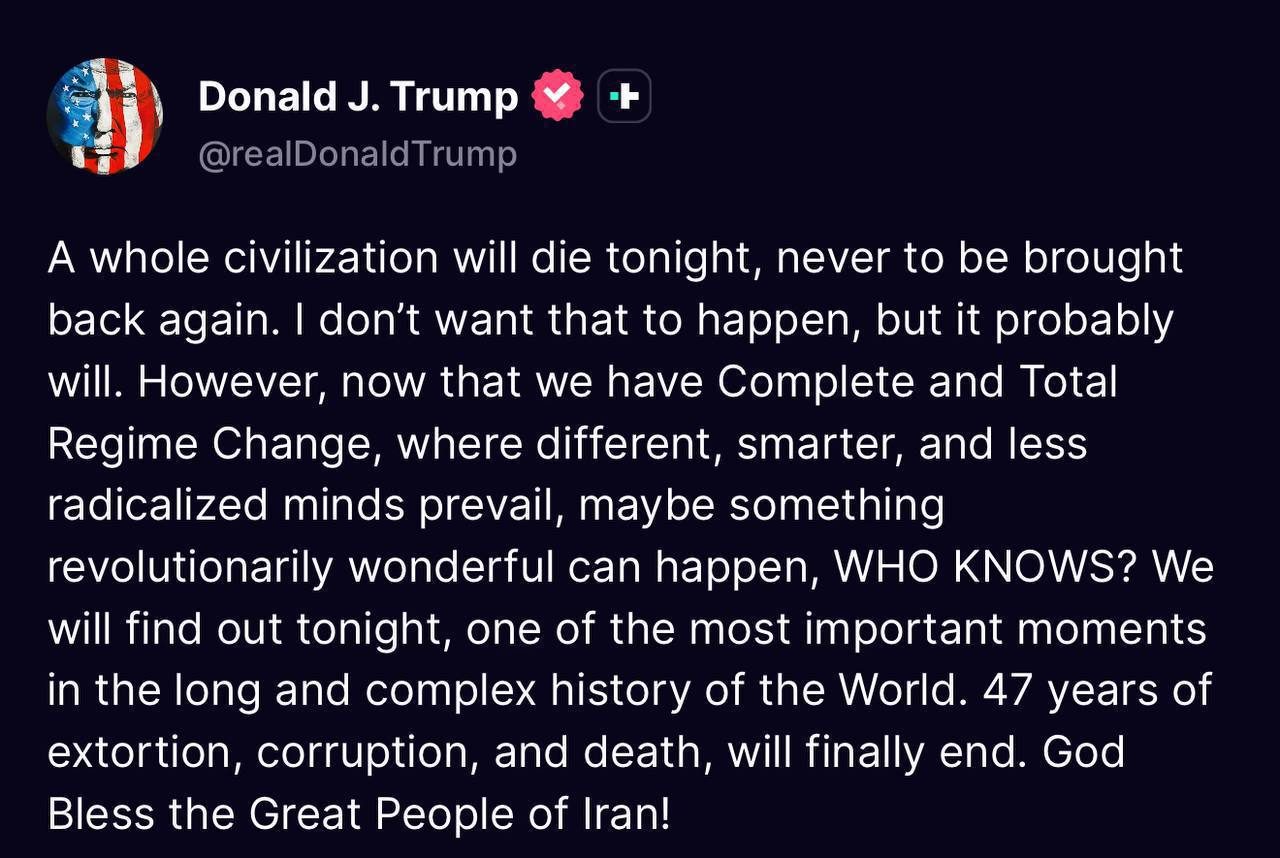 قال الرئيس الأميركي دونالد ترامب إن «حضارة كاملة ستموت الليلة، ولن يتم إحياؤها مرة أخرى أبدًا»، مضيفًا أنه لا يريد أن يحدث ذلك «لكنه سيحدث على الأرجح». وأضاف أنه بعد «تغيير كامل وشامل للنظام» مع «عقول مختلفة وأكثر ذكاءً وأقل تطرفًا»، فقد يحدث «شيء رائع بشكل ثوري»، قبل أن يتابع: «سنكتشف ذلك الليلة» في ما وصفها بأنها «إح
