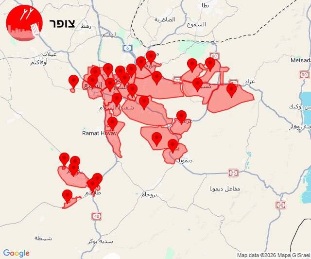 دوت صافرات الإنذار في مناطق واسعة من الجنوب عند الساعة 16:14 من يوم 07/04/2026، وشملت بلدات في جنوب النقب ومركز النقب، بينها أشليم، أبو كرينات، كسيفة، عرعرة النقب، تل عراد، بئر هداج، بئر السبع بأحيائها الجنوبية والشرقية والغربية والشمالية، إضافة إلى حورة وتل السبع وأم بطين، مع تحديد زمن إنذار تراوح بين دقيقة ودقيقة ونص